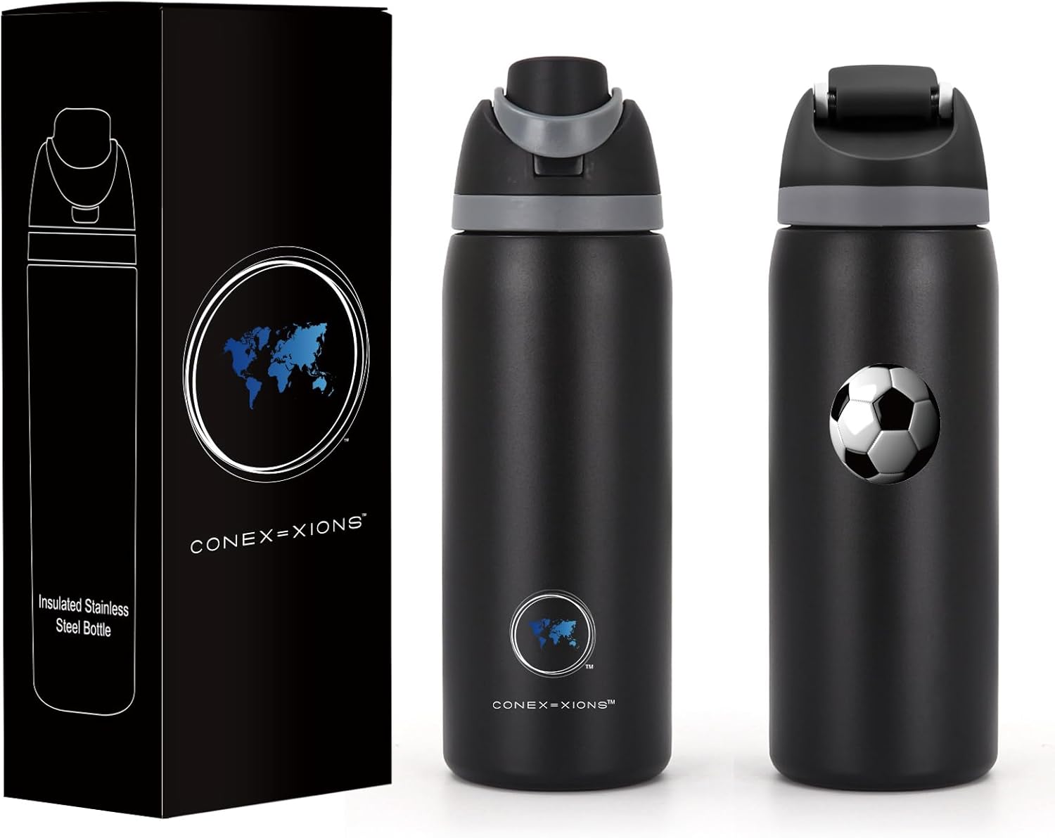 - Cool Soccer Design: The Conex=xions soccer water bottle is available in 2 colors. Choose from black or blue.